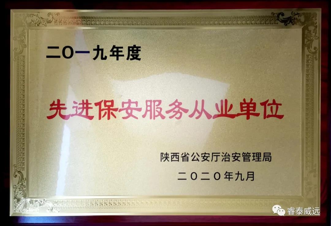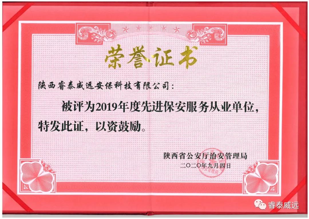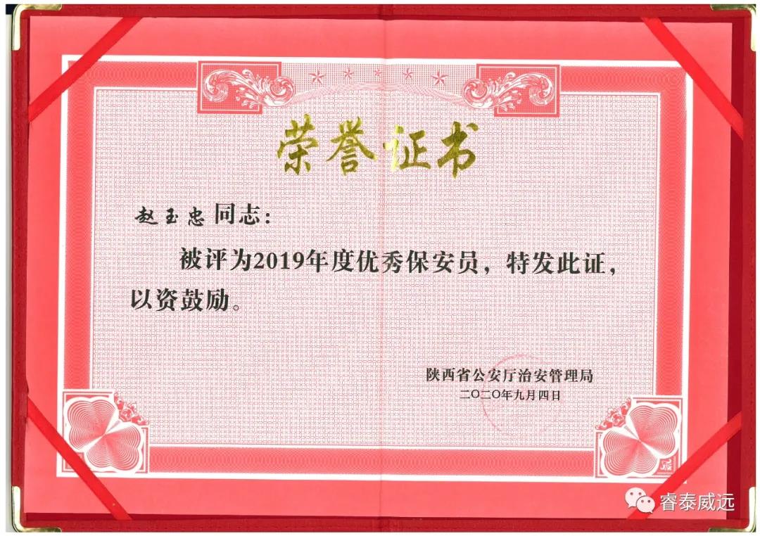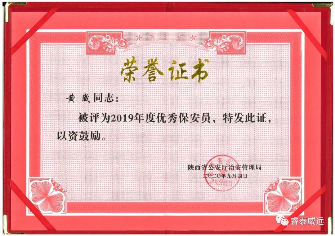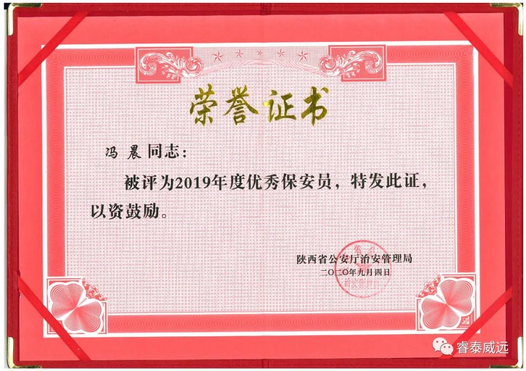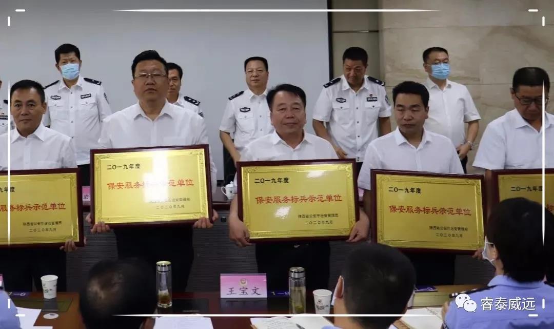 陜西睿泰威遠(yuǎn)安??萍加邢薰緲s獲“2019年度先進(jìn)保安服務(wù)從業(yè)單位”稱號(hào);公司總經(jīng)理黃崴、人防事業(yè)部大隊(duì)長趙玉忠、馮晨被評(píng)為全省優(yōu)秀保安員。
