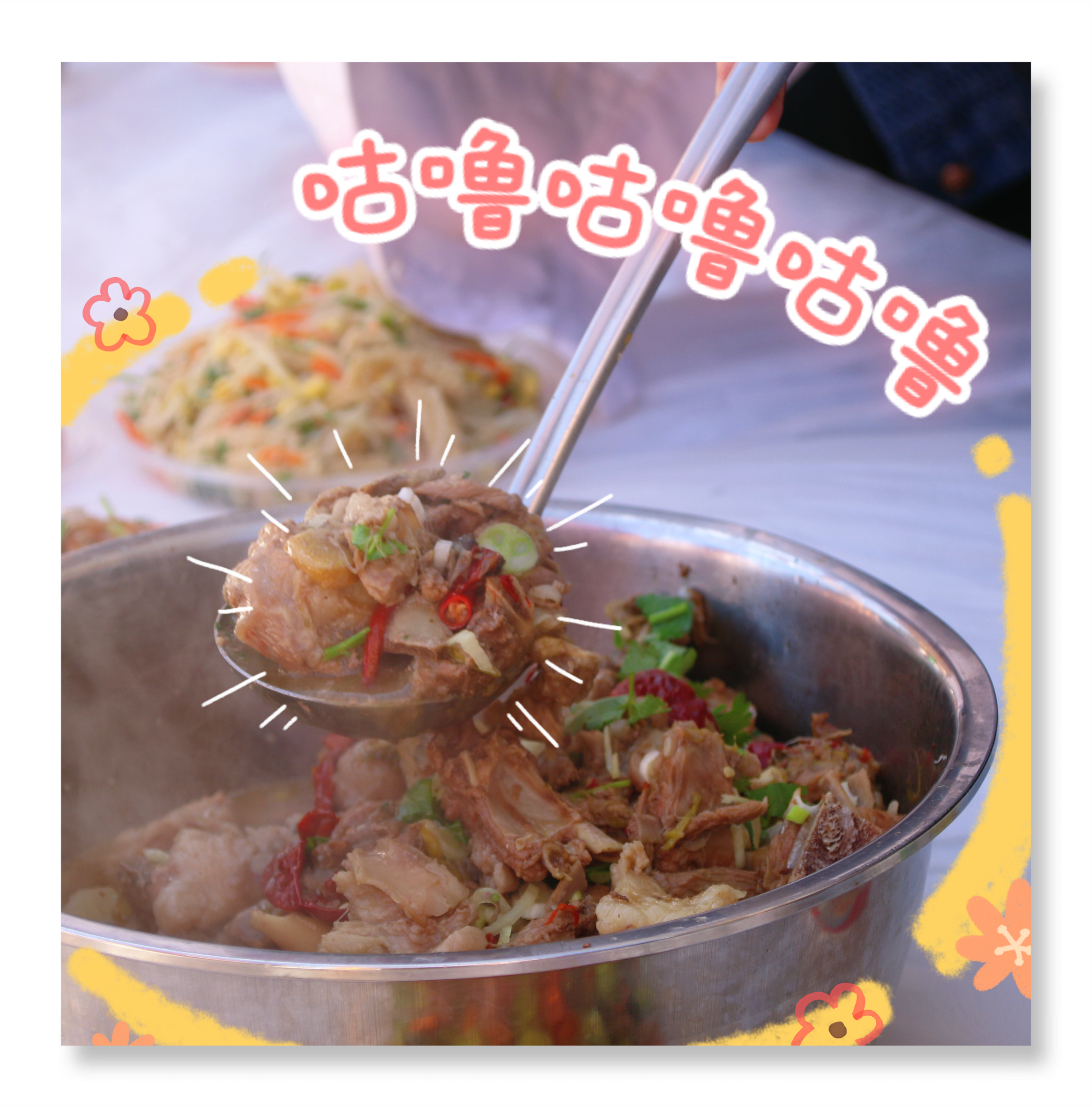 游戲結(jié)束后,香噴噴的燉羊肉擺上桌面,大家紛紛圍成一圈享受這美味佳肴。